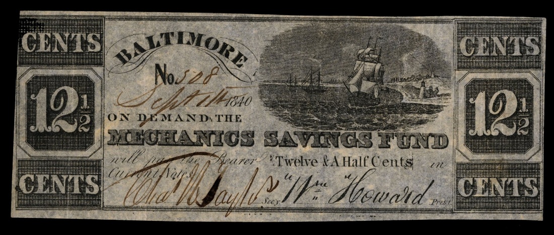 Maryland. Baltimore. Mechanics Savings Fund Scrip Note Assortment. 6 1/4 Cents 5.125.3 R-6 Fine; 12 1/2 Cents 5.125.5 R-5 VF. Both with ships; 25 Cents 5.125.7 R-5 coin note VG details, small body hole; 25 Cents 5.125.9 R-5 VG; 50 Cents 5.125.11 R-5 Fine detail, trimmed into the ends; 50 Cents 5.125.12 R-6 Fine, mounting remnants. [6]