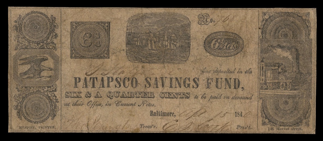 Maryland. Baltimore. Patapsco Savings Fund Selection. 6 1/4 Cents 5.133.1 R-4 About Fine, pinholes; 12 1/2 Cents 5.133.3 Fine details, small internal splits; 25 Cents 5.133.4 VF details, minor internal splits; 25 Cents 5.133.4 VF, pinholes; 50 Cents 5.133.5 (2 pcs.), both Fine; $1 5.133.6 Fine, pinholes; $2 5.133.7 R-5 VF, pinholes, small body split; $3 5.133.8 R-6 Fine details, stain. Note: the internal splits may be cancels. [9]