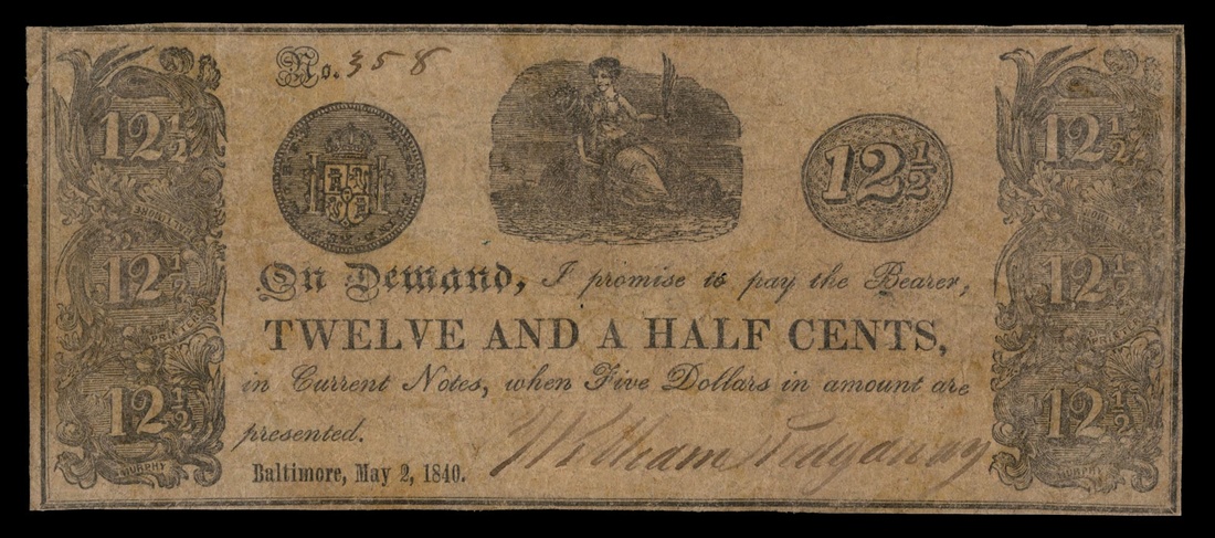 Maryland. Baltimore. (Store of) William Ridgaway. 12 1/2 Cents. May 2, 1840. (5.141.2) No.358. Woman seated. Spanish coin, left. Printer, Murphy. About Fine.