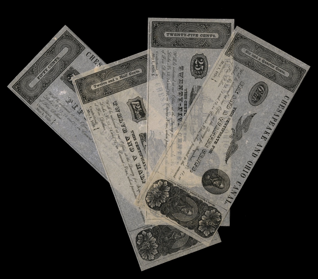 Maryland. Cumberland. Chesapeake and Ohio Canal 1838 R-7 George G. McPherson Scrip Assortment. 6 1/4 Cents 24.9.1 eagle, Franklin, Franklin, Almost Uncirculated; 12 1/2 Cents 24.9.2 agricultural implements, Franklin, Franklin, Almost Uncirculated; 25 Cents 24.9.3 ships, cotton, Washington, Franklin Almost Uncirculated; 50 Cents 24.9.4 eagle, Washington, Franklin, VF-EF; 75 Cents 24.9.5 agricultural implements,Washington, Franklin, VF-EF; $1 24.9.6 woman with plow, Washington, EF-AU. [6]