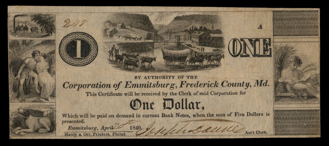 Maryland. Emmitsburg. Corporation of Emmitsburg 1841 Scrip Pairing. 50 Cents 44.1.11 Fine, trimmed slightly into the right end; $1 44.1.14 Fine. Both R-5. Both with the town spelled with one T. [2]