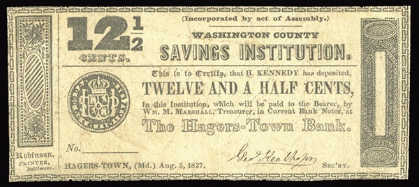 Maryland. Hagerstown. Washington County Savings Institution. 12 1/2. 1837. (60.11.4) Spanish coin, left, "HAGERS-TOWN," . Robinson. Fine.