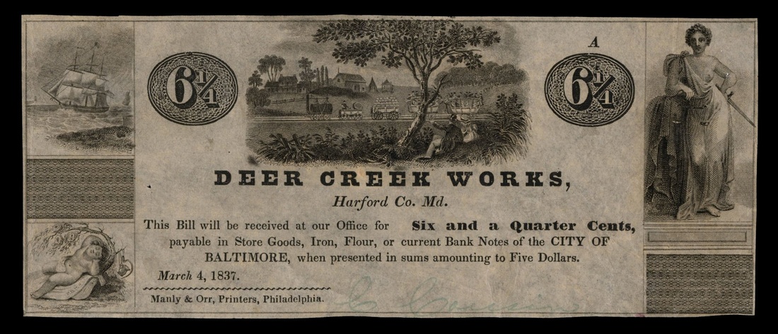 Maryland. Harford County. Deer Creek Works Assortment of 1837 Scrip. 6 1/4 Cents 34.1.2 R-7 VF-EF, faint signature; 12 1/2 Cents 34.1.3 EF-AU; 25 Cents 34.1.4 Uncirculated, small repaired splt; 50 Cents 34.1.5 Uncirculated; $1 34.1.6 VF-EF; $2 34.1.7 AU, corner tip repair. [6]