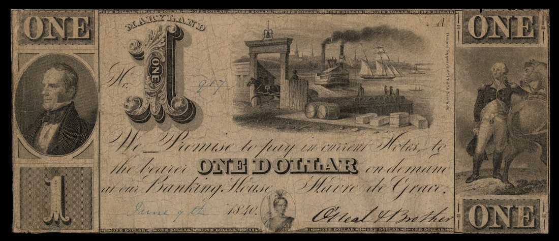 Maryland. Havre de Grace. O'Neal and Brother Banking House. 1840. (63.6.1) No.917. $1 63.6.1 harbor, Washington and horse, right. Draper, Toppan. Fine.
