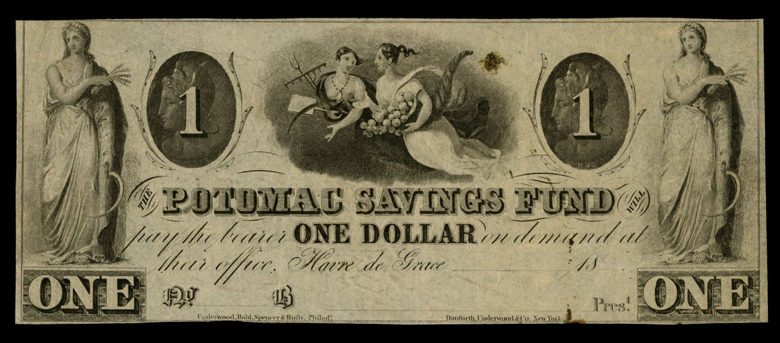 Maryland. Havre de Grace. Potomac Savings Fund Pairing. 50 Cents 63.8.4 woman seated, 1840's sailing ship, Fine, unissued; $1 63.8.5 two women flying, Fine, unissued, petty stains. [2]