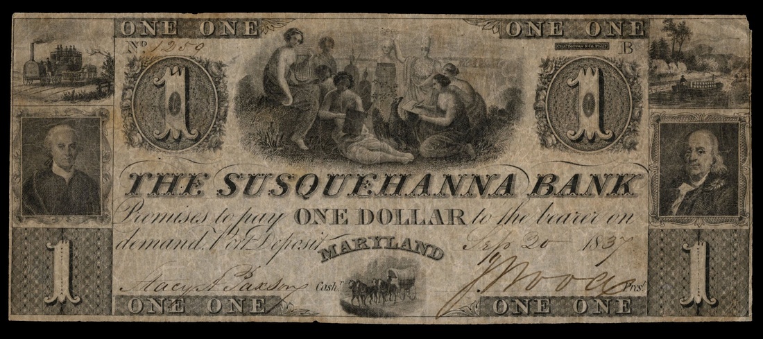Maryland. Port Deposit. Susquehanna Bank Assortment. Mostly 1837. $1 102.11.1 women and bust of Washington, Fine; $2 102.1.2 two women, Fine; $3 102.11.3eagles and shields flank portrait, About Fine, pinholes, $5 102.11.4 women, wheat and shield, Fine, some stains on the back; $10 102.11.6 rear view of early train, Uncirculated, but trimmed just into the right border; $20 102.11.8 woman and spindle, Uncirculated unissued remainder. [6]