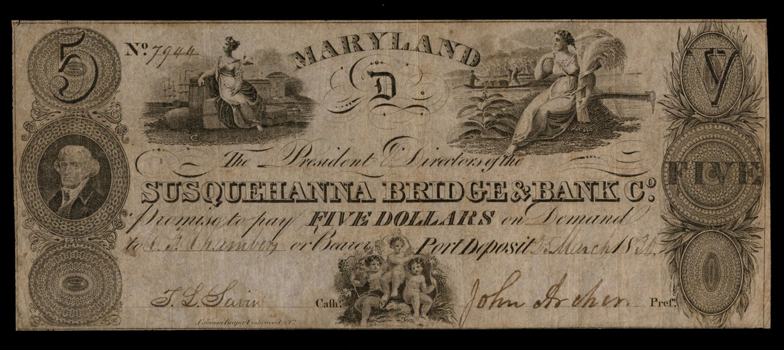 Maryland. Port Deposit. Susquehanna Bridge Assortment. 1830 to 1833. $5 102.12.12 seated women flank plate letter, Fine; $5 102.12.14 boats and bridge(2 pcs.), Fine, Fine with pinholes; $5 102.12.15 two women and shield, F-VF; $10 102.12.20 man and cow, About Fine, CC, pinholes; $10 102.12.21 three maidens, About Fine; $10 102.12.22 view of early train from the rear, F-VF, scattered pinholes; $20 102.12.26 eagle and shield, Fine; $20 102.12.27 Cere and child, Fine details, some graffiti, ink erosion and pinholes; $20 102.12.28 woman and spindle, VG-Fine, pinholes; $50 maiden, VG, stains, pinholes. [11]