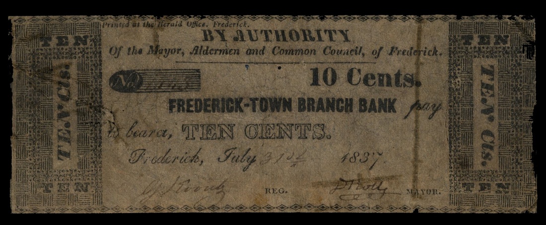 Maryland. An Assortment of Frederick-Town Branch Bank 1830's and Other Maryand Notes. Frederick-Town: 10 Cents 51.1.6 About Good; 57.1.12 $5, unissued remainder, CC, repairs; 51.1.19 50 Cents Fine, soiled; Port Deposit Loan 25 Cents 102.1.13 1837 VF, but with age spots; Ellicotts Mills: Patapsco Bank of Maryland 25 Cents 43.2.4 Fine detail, repairs; Liberty-Town Savings Institution 72.2.5 1837 plate note, R-7, Fine detail, but stained and repaired; Williamsport: John H. King 25 Cents 152.2.1 1842, Fine, minor ink erosion. [7]