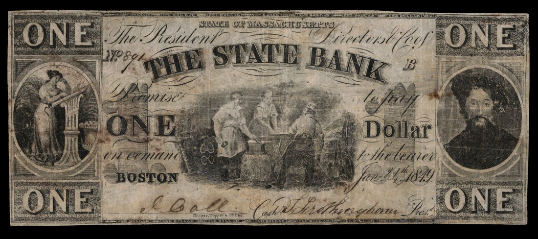 A Massachusetts Obsolete Bank Note Assortment. Boston, State Bank $1 1849, Fine details, light stains; Tremont Bank $1 1850 Fine; Chelsea Bank $1 1836 VG; Northborough Bank 25 Cents Unc. Unissued; Northhampton Bank $5 1847, Fine; Roxbury Bank $1 1837, woman with rake; Similar, Liberty & Justice; Similar $5 F-VF; Springfield Bank 10 Cents, Fine. [9]