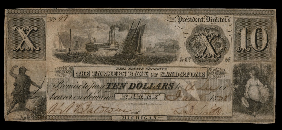 A Worthwhile Offering of Michigan Obsolete Notes. Barry, Farmers Bank of Sandstone $10 1838, Fine; Bank of Clinton $5 1837(2 examples), MI-105 G8, both Fine; Bank of Monroe $5 1836, MI-280 G28 Fine; Pontiac, Oakland County Bank - Bank of Central New York, Utica $5 1839, MI-345 G40a, VF, minor edge repair; Clinton Canal Bank at Pontiac $1 1837, MI-325 G2, Plate note, Fine; Bank of Ypsilanti $5 1836 (2 examples), MI-465 G8, both Fine, but one has a thin area. [8]