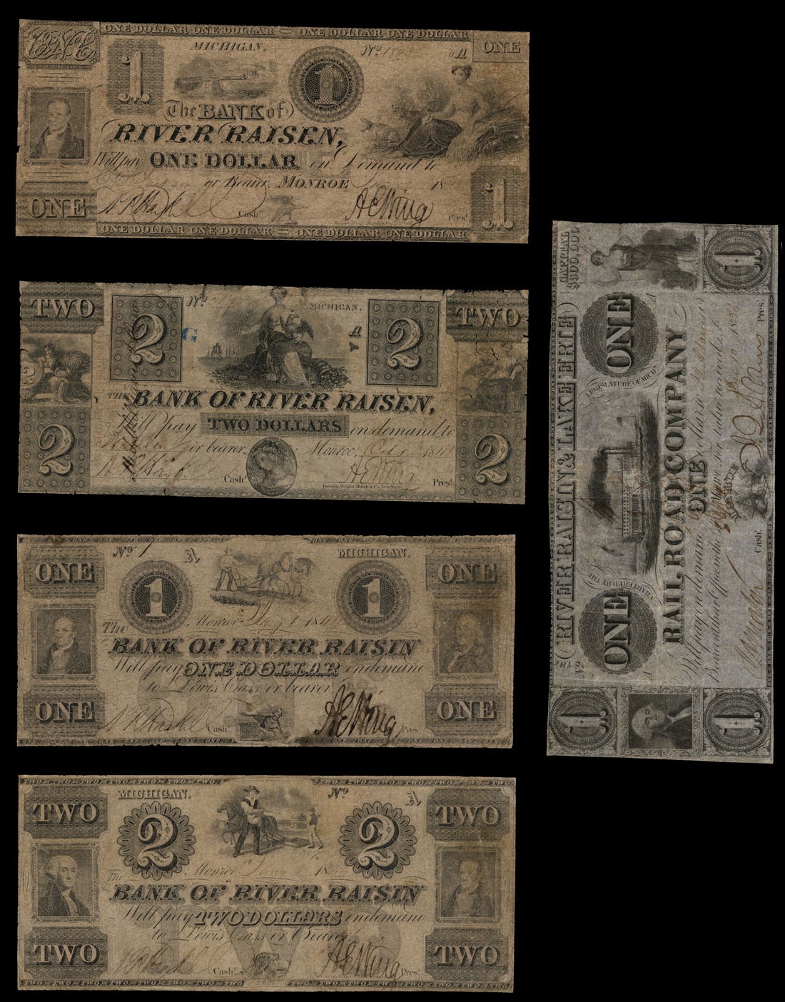 Michigan. Monroe. River Raisin Obsolete Notes. Bank of River Raisin $1 1843, MI-285 G40 VG-Fine; $2 1841, G28, VG; $1 1844, G42, VG; $2 1844, G46, Fine; River Raisin & Lake Erie Rail Road $1 1836, VF, slit cancel. [5]
