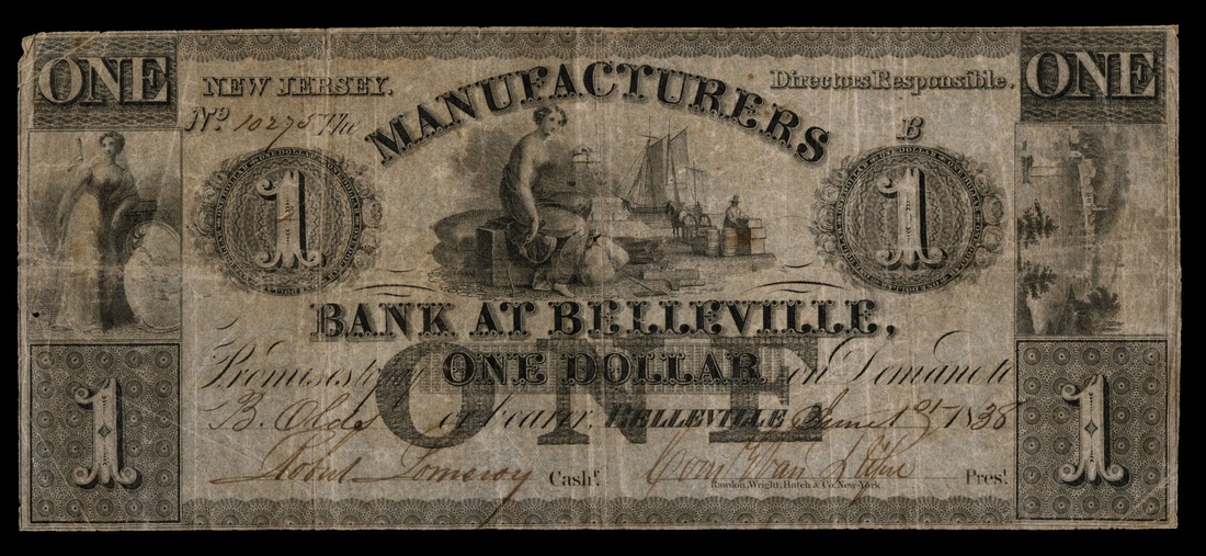A Nice Grouping of New Jersey Obsoletes. Manufacturers Bank at Belleville $1 1838, Wait 11, Fine, pinholes; Similar $2 1839, Wait 138 R-6, Fine, small repaired split; Bridgeton, Cumberland Bank $1 1839, Fine; State Bank at Camden Near Philadelphia $1 1841, Wait 324, Fine; Protection & Lombard Society $1 1820, VF-EF, small tear; Peoples Bank of Patterson $5 1844, Wait 1909, VG with small hole cancels.