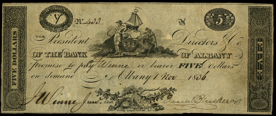 New York. A Pleasing Assortment of Albany Obsolete Notes. Bank of Albany $1 1841(2),Good details, pinholes and VF-EF, remainder. Both with a bull at the center. Unlisted in Haxby; Similar, $5 NY-30 S20, VF-EF, remainder; Similar $5 1833, not in Haxby, Liberty & Justice flank shield, Fine details, small repaired edge split; Albany Exchange Bank $1 1843, NY-40 C2a, Fine, pinholes; Similar $5 1843 not in Haxby, VF, repaired edge splits; Commissioners of the Canal Fund 1837 $900 sight draft, AU; Canal Bank of Albany $1 1843, NY-45 G22F-VF; Mechanics & Traders Bank $5 1838, not in Haxby, cattle, woman seated, left, Fine detail, but pinholes and internal splits; New York State Bank $1 1838, NY-100 C46, About Fine, stains; Similar $3 1842, C180, Fine; Similar $5 1845, S5, Fine details, stains. [12]