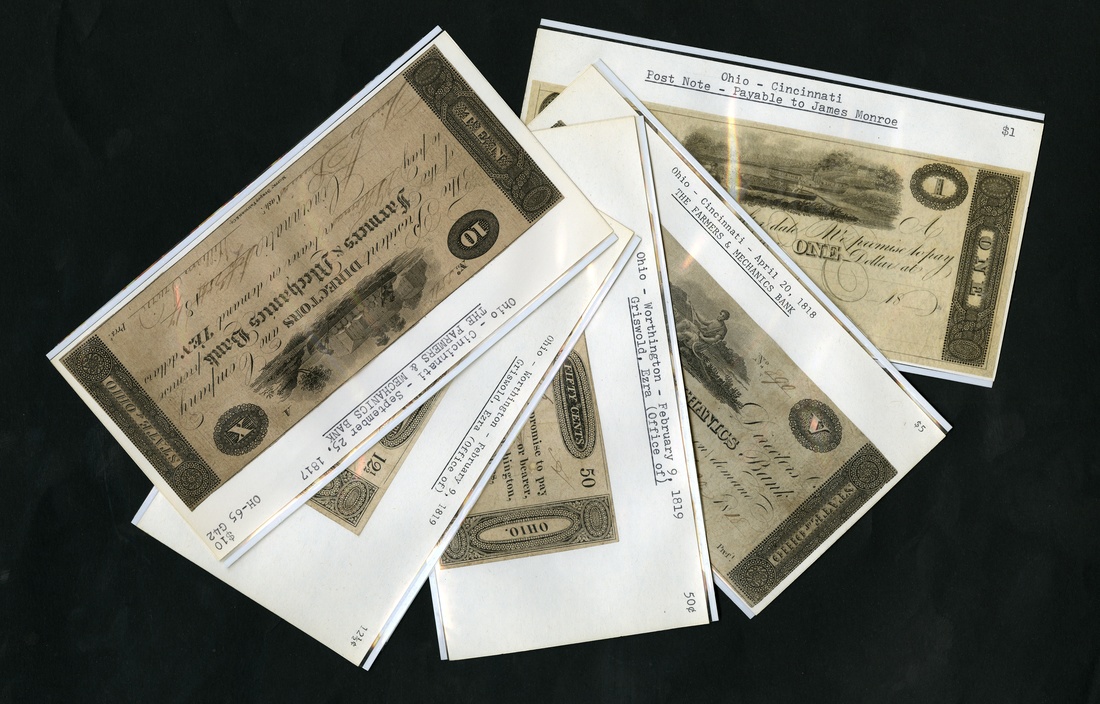 Ohio. Selection of Cincinnati and Worthington Obsolete Notes. Cincinnati, Farmers & Mechanics Bank $5 1818, Fine; Similar $10 1817, men rowing, Fine; Post Note payable to James Monroe, Unc. Remainder; Worthington, 12 1/2 and 50 Cents, 1819 & 1820, Fine. Both are Fine, and fully issued. [5]