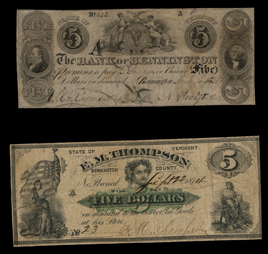 Vermont. Bank Note Assortment. Bank of Bennington $5 1821 VT-10 G10 Fine, pinholes; Bennington County, E. M. Thompson $5 1874 Fine; Bank of Burlington $2 1843. [2]