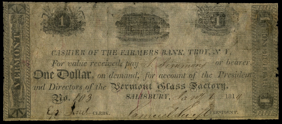 Vermont. Salisbury. Vermont Glass Factory - Cashier of the Farmers Bank, Troy. $1. 1814. Contemporary counterfeit. No.103. Glass factory. About Fine.
