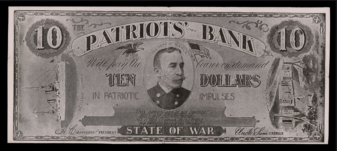 Massachusetts. Revere. $10. 1890s. Advertising note. Admiral Dewey, "HERO OF MANILA." Battleship Olympia. On the back, "The Thurston Café." Fine fish dinners. Two cartoon-style illustrations. EF, very small edge repair. Scarce.