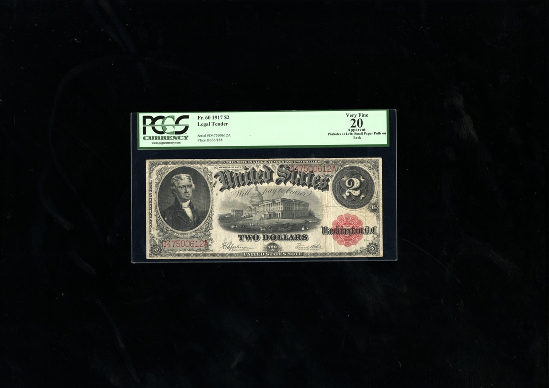 Fr.60. $2. Legal Tender. 1917. No. D47500612A. PCGS Very Fine 20 Apparent. Pinholes at Left; Small Paper Pulls on Back.