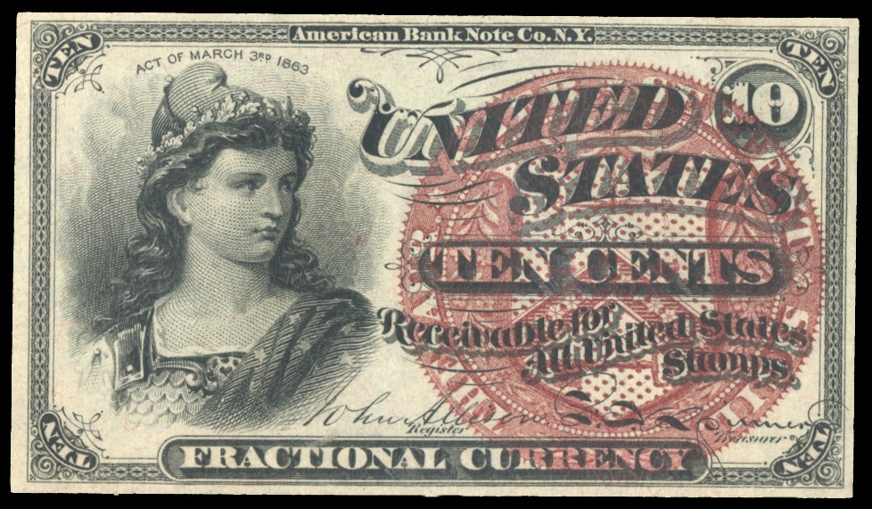 Fr.1257. 10 Cents. Fourth Issue Fractional Currency. Liberty. 40mm seal. Watermarked paper. PCGS Gem Uncirculated 65 EPQ.