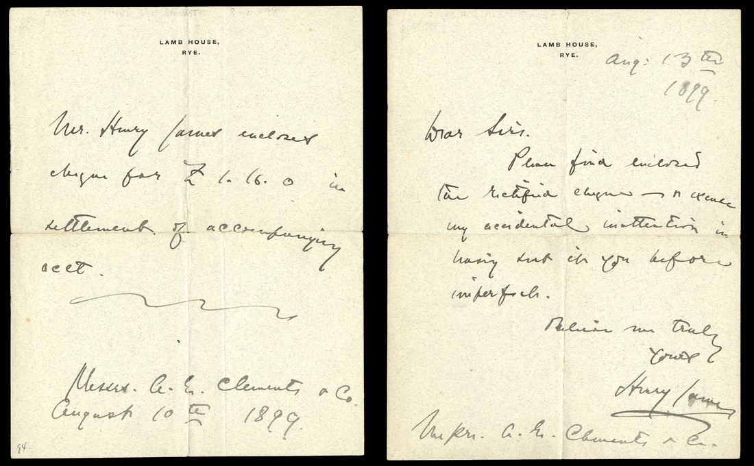 James, Henry (1843-1916). Although James was an American, most of his writing career was spent in Britain. His three most important novels, "The Wings of the Dove", "The Ambassadors", and "The Golden Bowl", point out the contrast in life styles in Britain and America. ALS, 4to. 2 pages. Lamb House, Rye, Sussex. To Messrs A. G. Clement and Company. August 13, 1899. Regarding checks he had issued in error. Signed "Henry James." Very good condition. From the Collection of Diana Herzog.