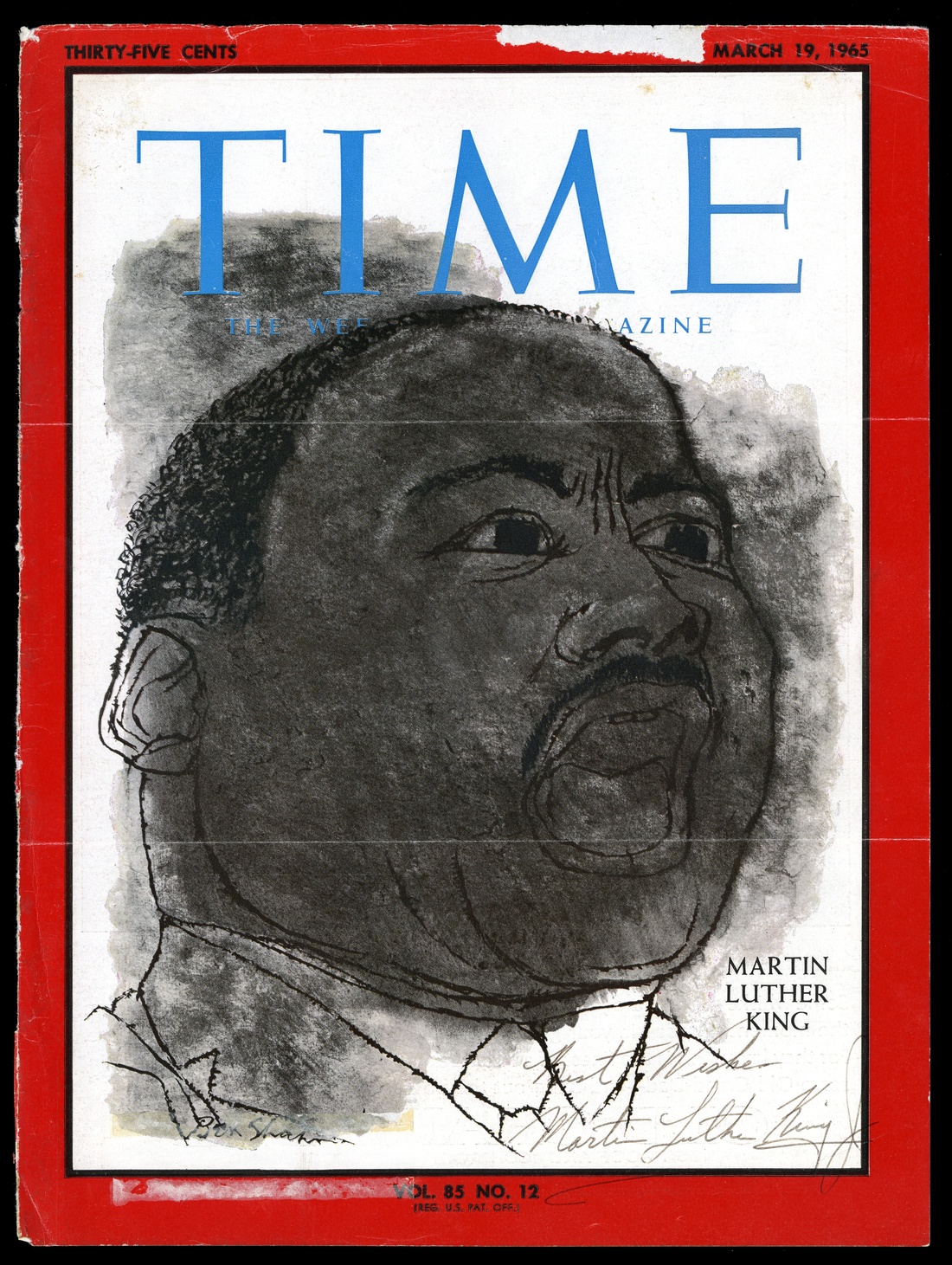 King, Martin Luther. (January 15, 1929-April 4, 1968). American Baptist minister and activist; a leader in the African-American Civil Rights Movement who saw equality for blacks as a fundamental right. His nonviolent protests earned him the respect of people of all races, and his untimely death at the hands of an assassin had a profound and lasting impact on most Americans. While King signed many items, the demand for his signature continues to grow, and far exceeds the supply. 4to Magazine Cover Signed. In the lower right corner of the detached cover of Time Magazine, Volume 85, No.12, March 19, 1965, King signs in brown ink "Best Wishes / Martin, Luther King, Jr." The cover, which bears a portrait of King (by artist Ben Shahn) giving an impassioned speech, has some minor wear at the folds, and a scuff in the upper margin. There are light remnants of a remove address label, but the overall condition is in very good condition. Also included is an image of King, suitable for framing. A similar signed cover, but not quite as nice, brought $6,875 in a Heritage Oct 17, 2013 auction. Ex. Lot 172 from R. M. Smythe's May 14, 2004 sale. From the Collection of John Herzog.