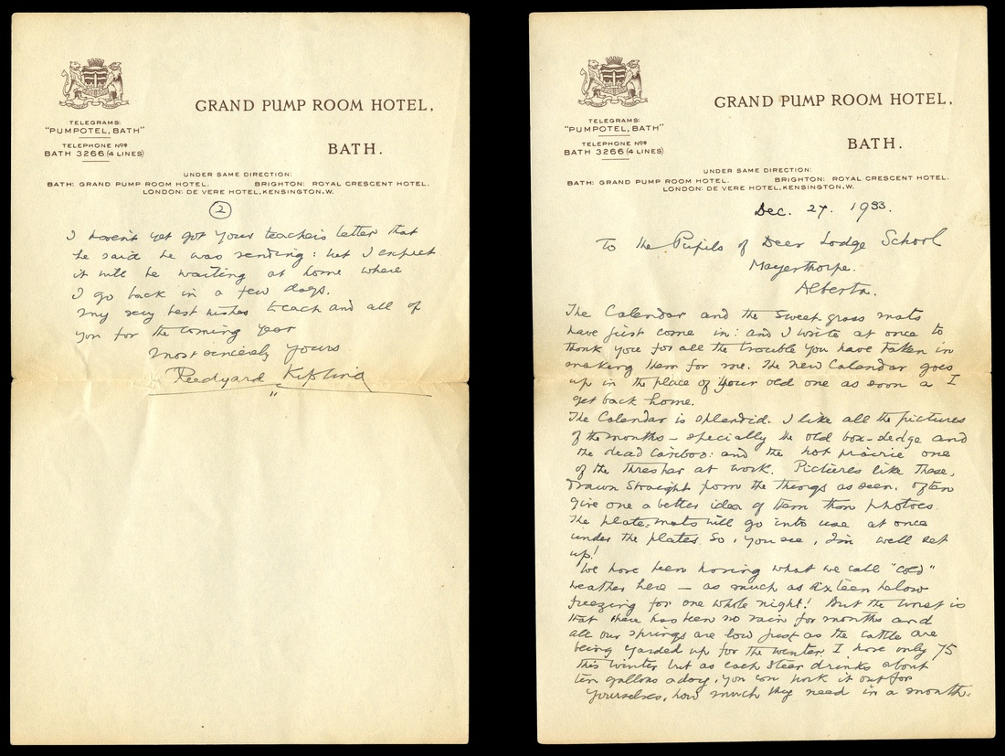 Kipling, Rudyard (1865-1936). English short story writer and novelist. Nobel Prize winner. His important works include "The Jungle Book", "Gunga Din", "Kim" and "The White Man's Burden". ALS. 8vo. 1 1/2 pages. From the Grand Pump Room Hotel, Bath. Dec. 27, 1933. To the Pupils of Deer Lodge School, Mayerthorpe, Alberta. Kipling profusely thanks the pupils for the custom made calendar and place mats they sent him. He also discusses the difficulties the extreme waether conditions and their effect upon the 75 head steers on his property (Bateman's, a 17th-century house located in Burwash, East Sussex, England, where Kipling. lived from 1902 to his death in 1936). Signed "Rudyard Kipling." Also included is a photograph of Kipling, suitable for framing. All in very good condition. From the Collection of Diana Herzog .