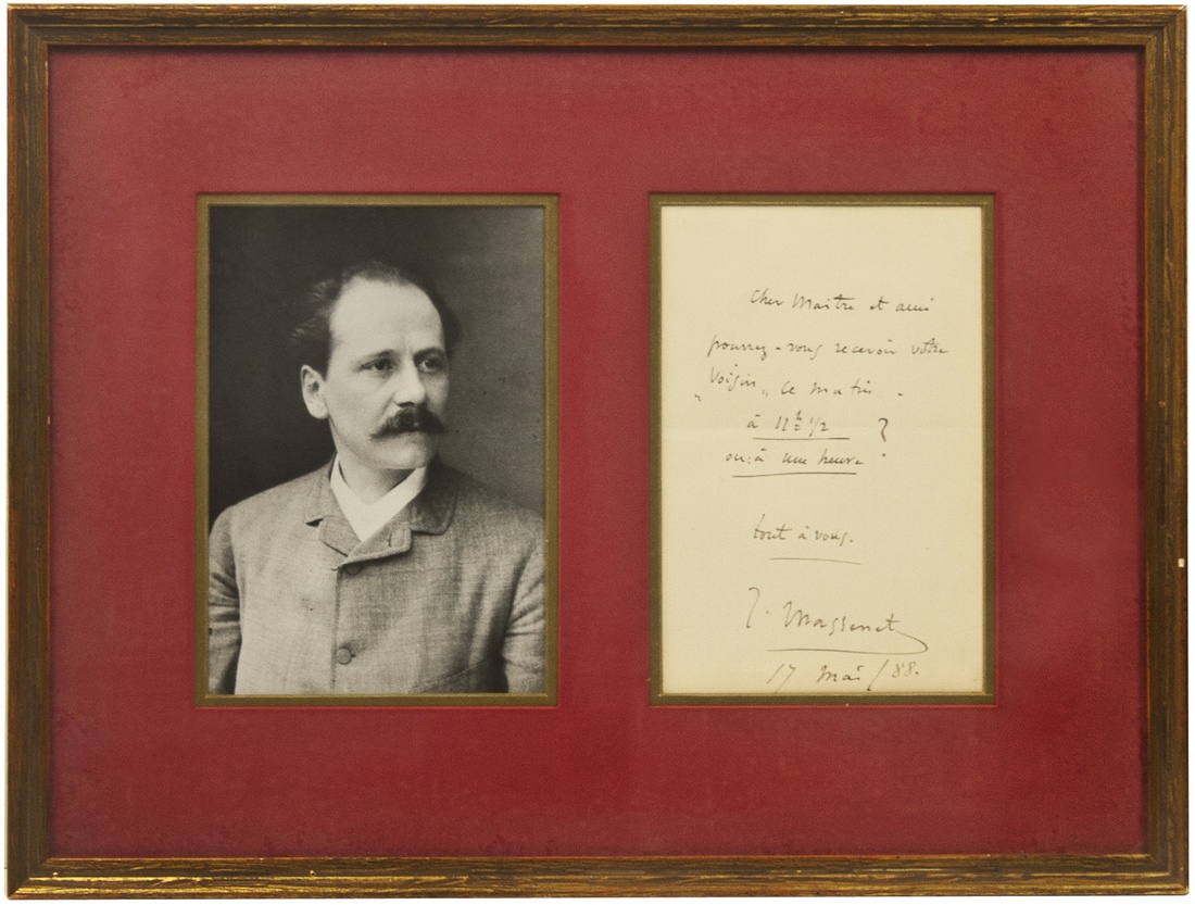 Massenet, Jules. (1842-1912). Composer. Autograph Letter signed "J. Massenet", 1p, 4¾" x 6½." May 17, 1888. In French, requesting a meeting with his neighbor. Framed with a photograph. Massenet was known for his comic opera Don César de Bazan (1872). His other operas include: The Virgin (1880), Manon (1884, and considered by many to be his masterpiece), Le Cid (1885) and Werther (1892). Overall, fine condition. From the Collection of John Herzog.