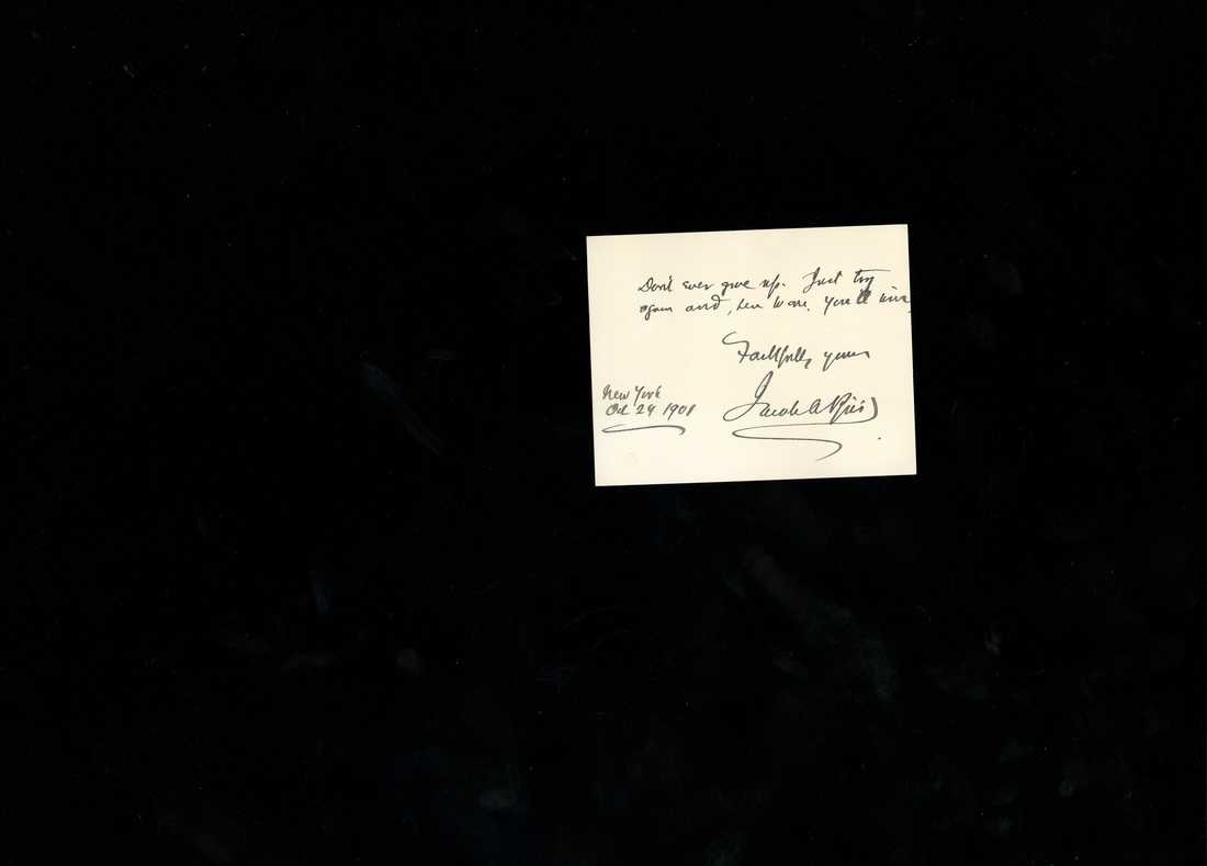 Riis, Jacob (1849-1914). Danish-born American journalist and New York City police reporter. Known for his crusades against slum conditions in New York City. Author of "How the Other Half Lives." AQS. October 29, 1901. "Don't ever give up. Just try again…You'll win." Crisp, clear signature. Theodore Roosevelt said that Riis was the best American he ever knew. From the Collection of Diana Herzog.