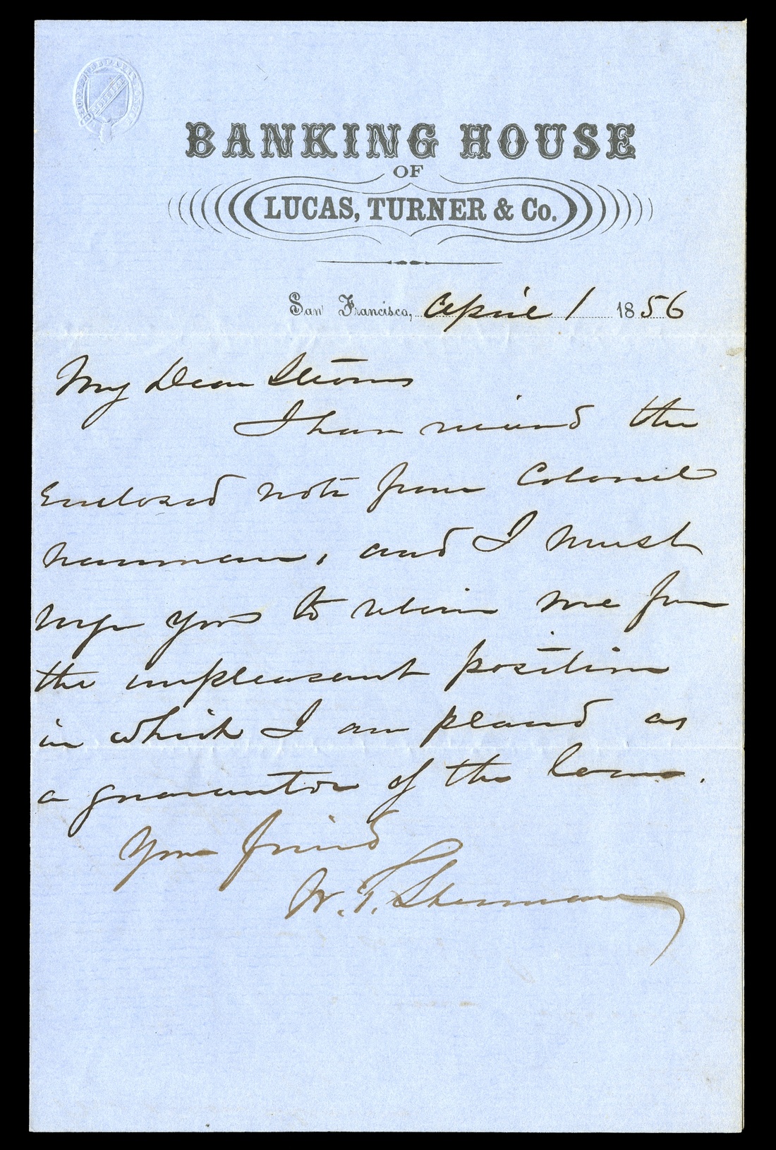 Sherman, William T. (February 8, 1820-February 14, 1891). Autographed Letter Signed "W. T. Sherman." 8vo, 3/4 page on imprinted "Banking House of Lucas, Turner & Co" stationery. San Francisco. April 1, 1856. To "My Dear Stevens" (perhaps Lieutenat T. H. Steven, who rented a house from him). "I have received the enclosed note from Colonel Nanman, and I must [beg] you to release me from the unpleasant position in which I am placed as a guarantor of the loan." Sherman was a managing partner in Lucas, Turner & Co., which was a California branch of these St. Louis-based bankers. In 1857 a San Francisco bank panic forced the company to go out of business in California. Sherman's signature is rarely encountered on bank-related matters. Ex. R. M. Smythe & Co. November 29, 2001 sale. From the collection of John Herzog.