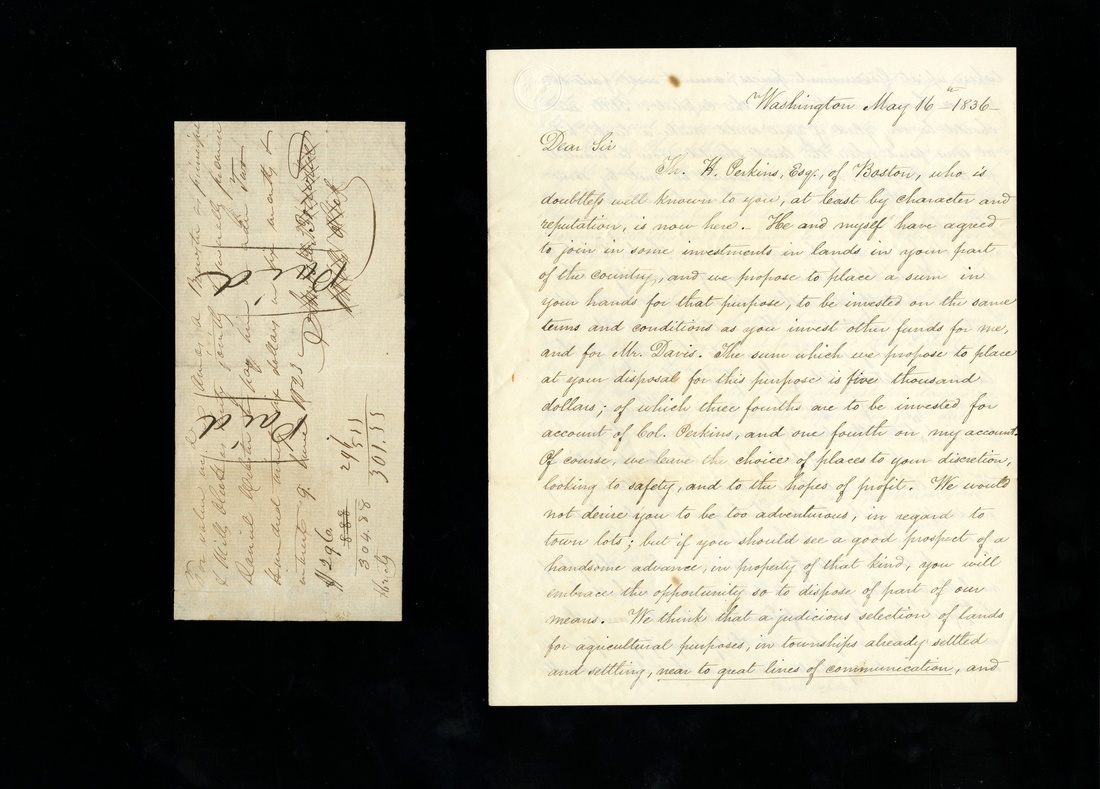Webster, Daniel. (January 18, 1782-October 24, 1852). Letter (in the hand of an amanuensis) signed by Webster and countersigned by "Th. Perkins." 2 3/4 pp. 4to. Washington. May 16, 1836. To Joseph R. Williams at Toledo, Ohio. Perkins and Webster "...have agreed to join in some investments in lands in your part of the country, and we propose to place a sum in your hands for that purpose, to be invested on the same terms and conditions as you invest in other funds for me..." Minor splits along the centerfold. Minor age toning, but otherwise Very Good. Also included is a hand-written draft for $296, endorded on the verso by Daniel Webster, and an image of Webster, drawn from life, and engraved by James B. Longacre. From the collection of John Herzog.