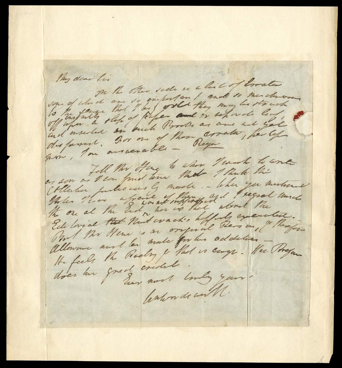 Wordsworth, William (1770-1850). English poet who, along with Samuel Coleridge, helped launch the Romantic Age in English literature. Letter signed "William Wordsworth", the text in the hand of his wife Mary, 1 page, 8vo. To an unknown recipient. "On the other side is a list of Errata some of which are so important and so mischevious to the sense that they may be struck off instantly upon a slip of paper..." Tipped on to a paper matte. The left margin has a long split, and a small piece of paper is missing where the wax seal was attached. From the Collection of Diana Herzog.