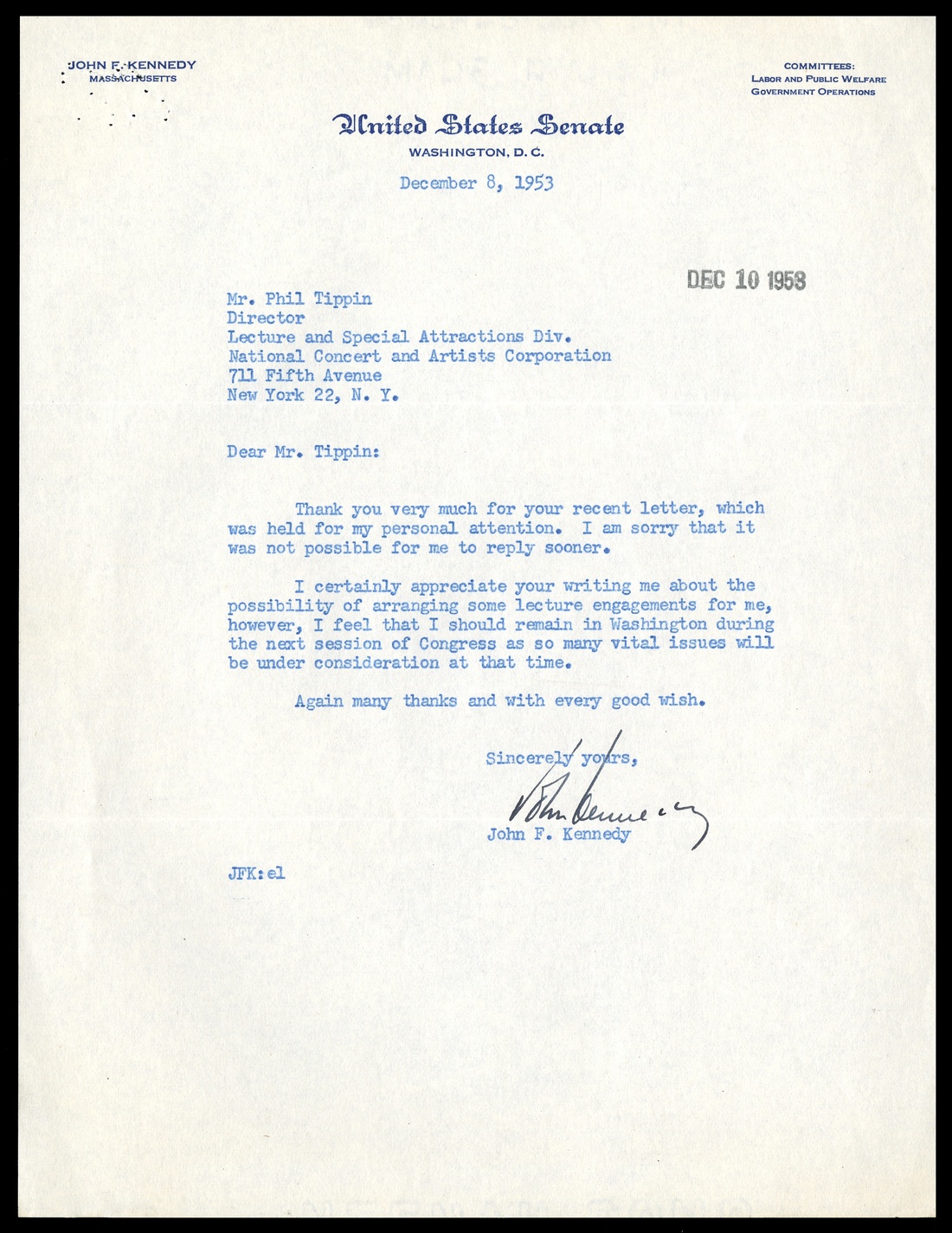Kennedy, John F. Thirty-fifth President of the United States, 1961-1963. December 8, 1953. On United States Senate stationery. 8vo. TLS. To Phil Tippin, Director of Lecture and Special Attractions Division, National Concert and Artist Corporation, New York. "Thank you very much for your recent letter, which was held for my personal attention. I am sorry that it is was not possible for me to reply sooner. I certainly appreciate your writing me about the possibility of arranging some lecture engagements for me, however, I feel that I should remain in Washington during the next session of Congress as so many vital issues will be under consideration at that time." Kennedy served in the U.S. House of Representatives from 1947 to 1953, and then he became a United States Senator. Very Fine condition, with some pinholes in the upper left corner. An opportunity to obtain one of the most desired Presidential autographs in the entire series.