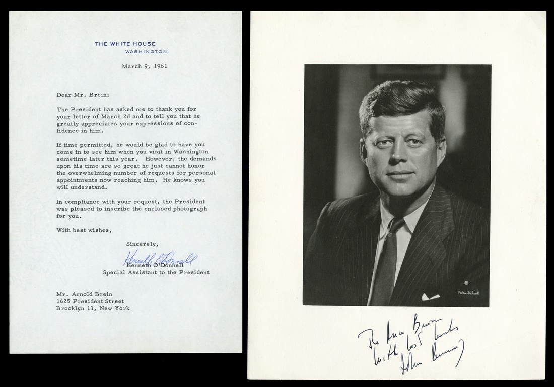 Kennedy, John F.  Thirty-fifth President of the United States, 1961-1963. Black & White 8 x 10" Photo of JFK signed "To Arnie Brein With best Wishes John Kennedy". accompanied by typed letter, dated March 9, 1961 on White House stationery from Kenneth O'Donnell, Special Assistant to the President thanking Brein for his letter, apologizing that the President is too busy for personal appointments and noting that a signed photo is enclosed. Very Fine. [2]