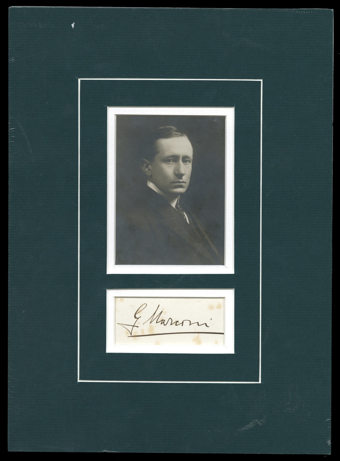 Marconi, Guglielmo (1874-1937). Clipped "G. Marconi" autograph, nicely matted with a photograph of the founder of the Wireless Telegraph & Signal Company (which later became the Marconi Company). Marconi made a commercial success of radio, innovating and building on the work of previous experimenters and physicists.