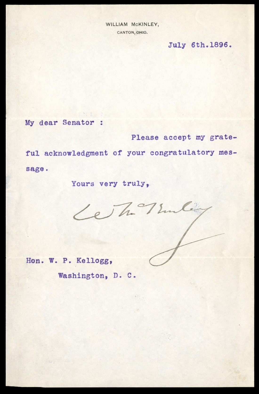 McKinley, William . Twenty-fifth President of the United States. TLS. 8vo. July 6, 1896. On his personal Canton, Ohio stationery. To Senator W. P. Kellogg. "Please accept my grateful acknowledgement of your congratulatory message." Very Fine.