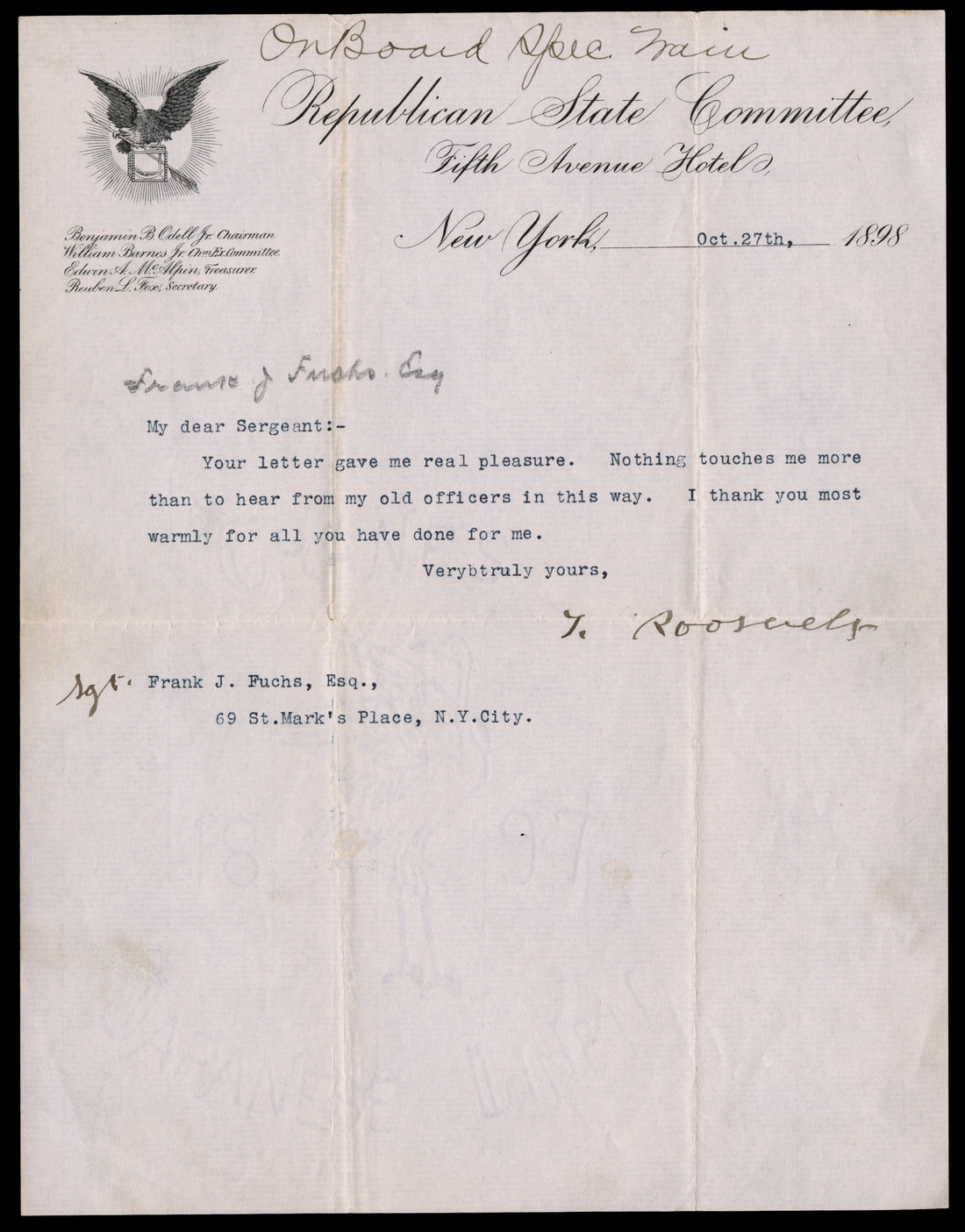 Roosevelt, Theodore. Twenty-sixth President of the United States, 1901-1909. American statesman, author, explorer, soldier, naturalist, and reformer. TLS. 8vo. October 27, 1898. On the stationery of the Republican State Committee, New York. To Sergeant Frank J. Fuchs, Esquire. "…Nothing touches me more than to hear from my old officers this way. " Very Fine.