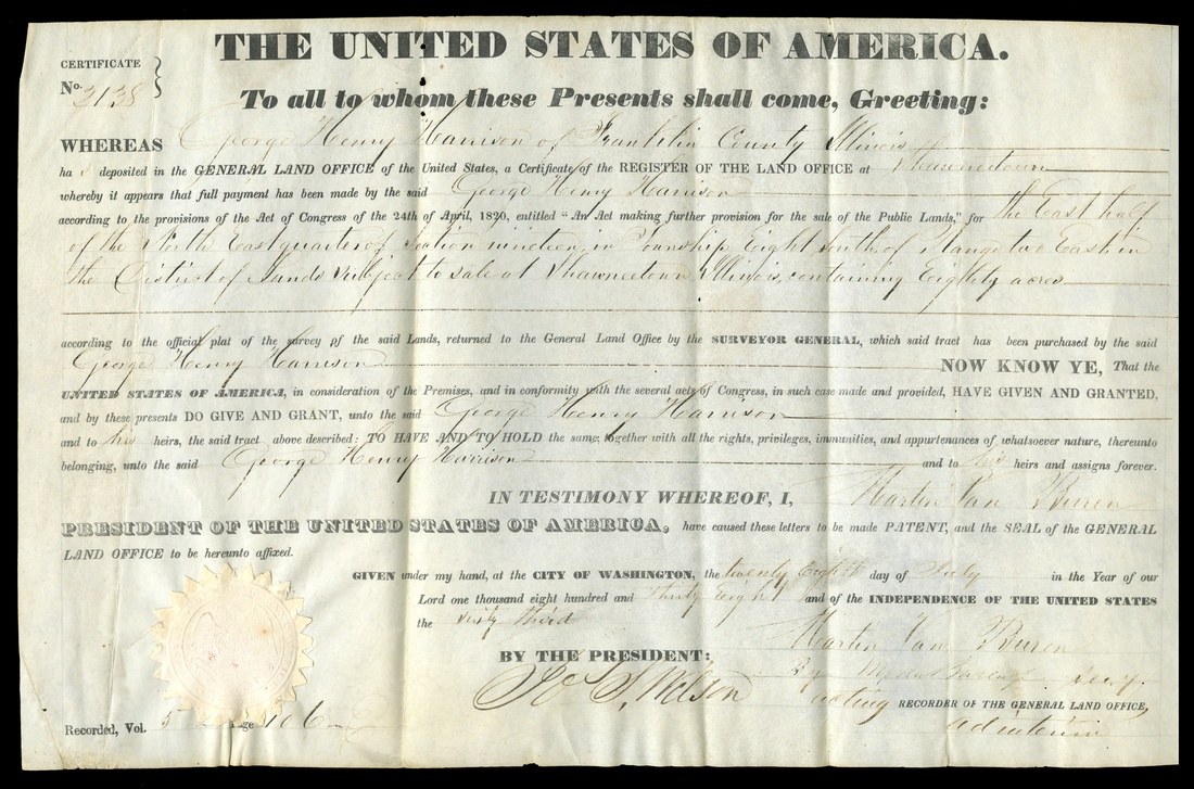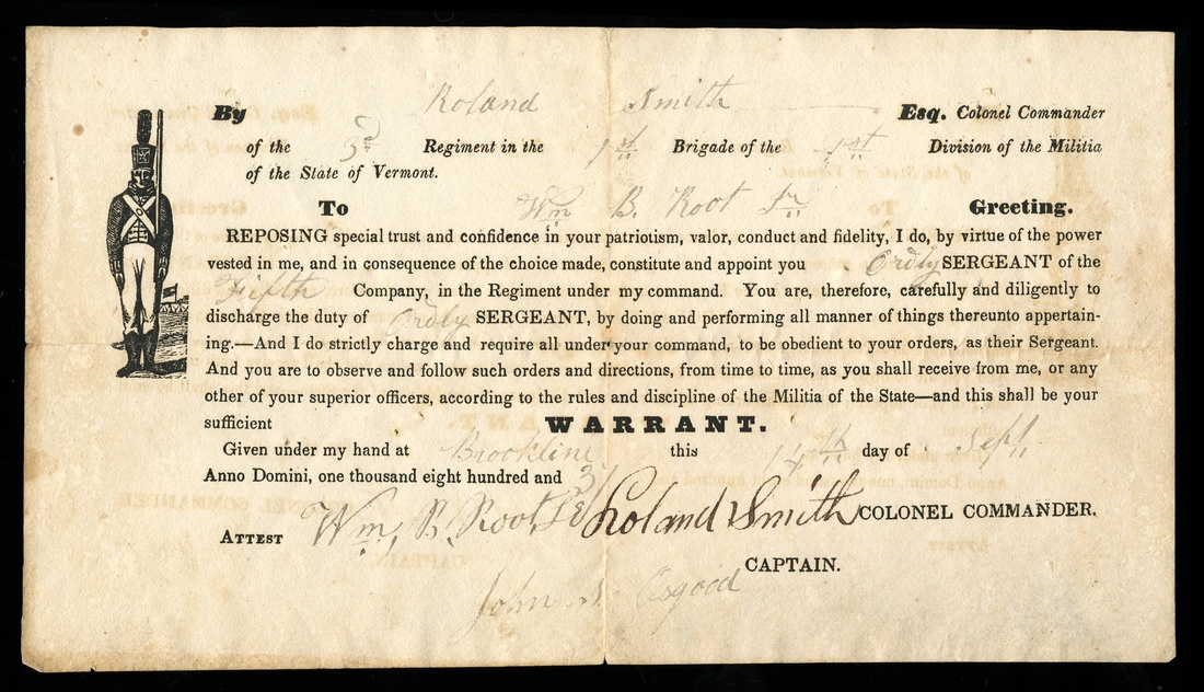 General Land Office Certificate Signed "Martin Van Buren," Pay Table Office Warrant for Service in the Continental Army, "Tweed Ring" Check, and Militia Appointment by Roland Smith, Brookline, Vermont. 1) Pay-Table Office, Nov. 18, 1782. 26 pounds, 16 shillings, three pence. Signed by Oliver Wolcott. 1837. Small body hole, and fold splits, otherwise Very Fine. 2) Appointment by Roland Smith of William B. Root to the position of Sergeant of the Fifth Company, Third Regiment, First Brigade. Soldier at left. Fine or so, with minor edge splits. 3) Impressive Land Office document, 1838, with secretarial signature of Martin Van Buren. 4) Chamberlain of the City of New York at the National Broadway Bank check. 1869. Signed by A. Oakey Hall as Mayor, Richard B. Connolly, Tweed Ring members. [4]