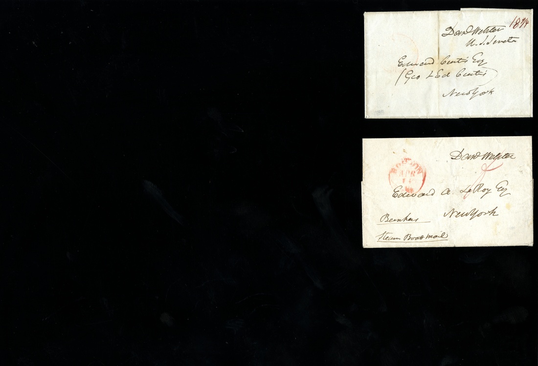 Webster, Daniel (January 18, 1782 - October 24, 1852). American statesman who served in the United States House of Representatives (New Hampshire 1813-1817 and Massachusetts 1823-1827). He also served as a U.S. Senator from Massachusetts (1827-1841 and 1845-1850), and was twice the United States Secretary of State. Pair of free franks. One sent by "Steam Boat Mail." Both sent from Boston in the 1830's. [2]