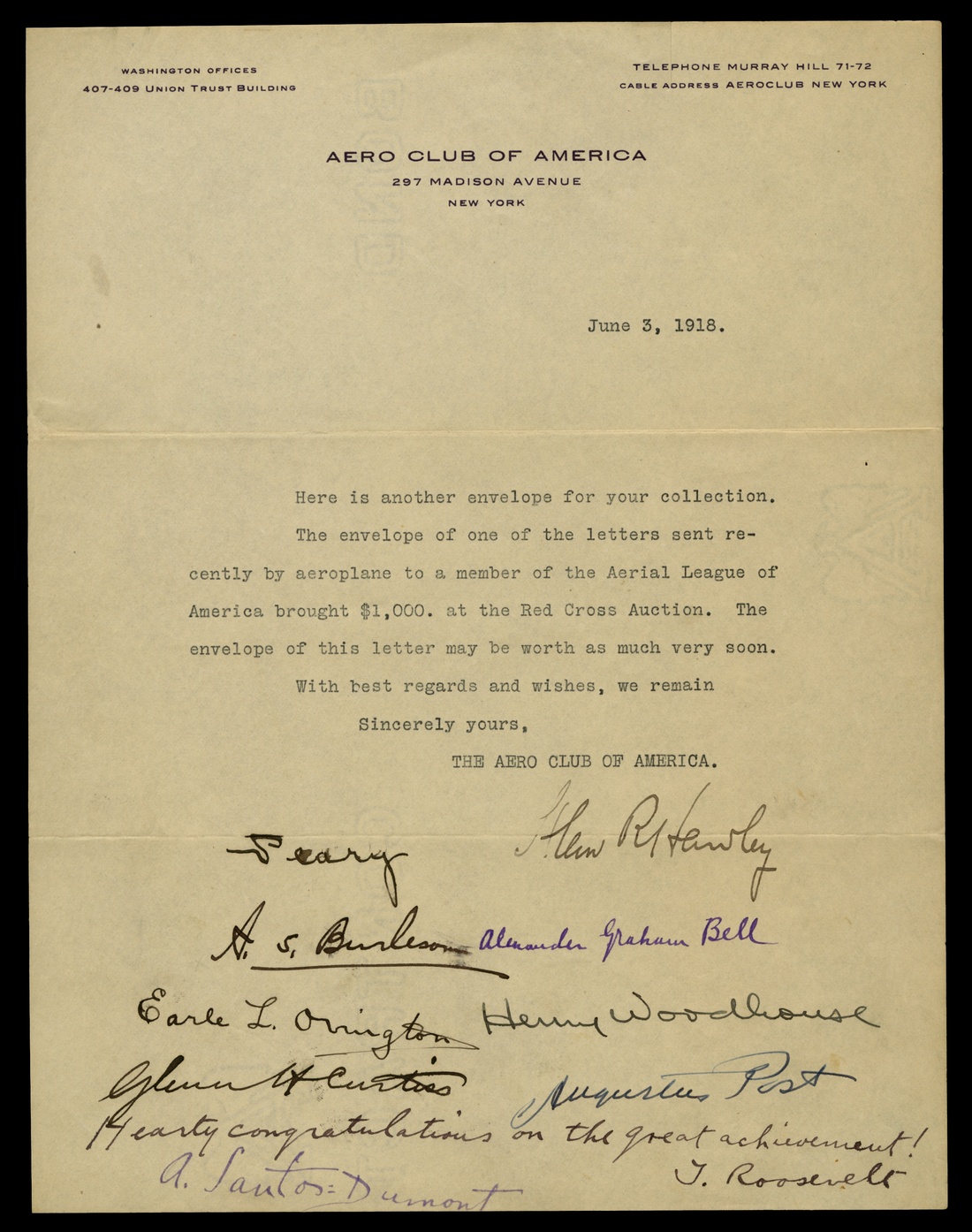 Wonderful Aero Club of America Letter Signed by Theodore Roosevelt, Alexander Graham Bell, Augustus Santos-Dumont and Others. From Alan Ramsay Hawley (President of the Club) to an unknown recipient. June 3, 1918, 297 Madison Avenue, New York. 8vo. TLS. "Here is another envelope for your collection. The envelope of one of the letters sent recently by aeroplane to a member of the Aerial League of America brought $1,000 at the Red Cross Auction. The envelope of this letter may be worth as much very soon…" The letter is signed at the bottom by the following: Robert Peary (signed "Peary"); A. S. Burleson; Alexander Graham Bell; Earle L. Ovington; Henry Woodhouse; Glenn Curtiss; Augustus Post; A. Santos-Dumont, and Theodore Roosevelt, who states "Hearty congratulations on the great achievement!" The Aero Club of America was a social club formed in 1905. It issued the first American pilot's licenses.