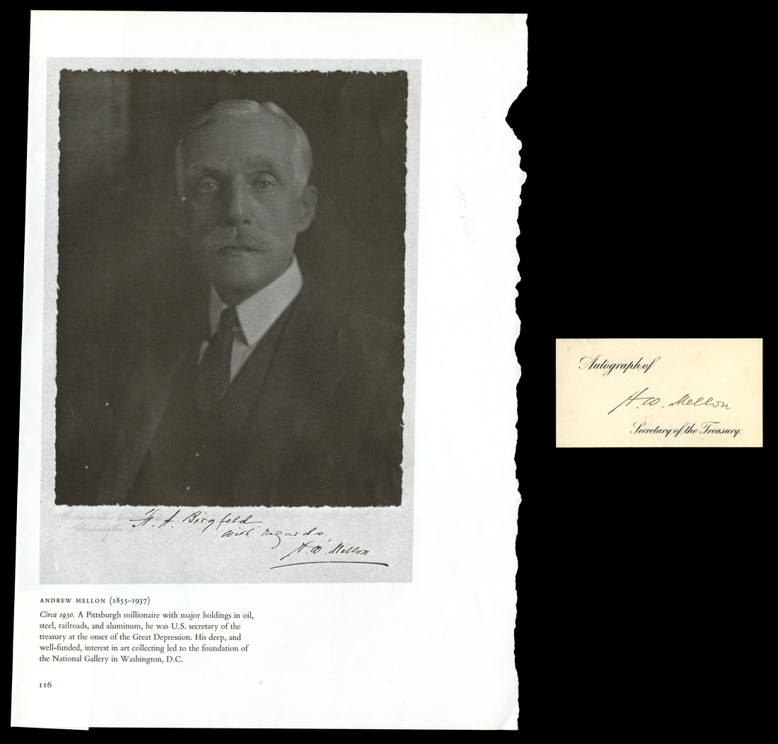 Autographs of Important Bankers and Industrialists. Frick, Henry Clay (1849-1919). American industrialist. DS. 1906 check drawn on the Fifth Avenue Bank in New York. Crisp signature. EF; Mellon, Andrew. Two "Autograph of" cards, and a TLS on Treasury letterhead; Dawes, Charles. Envelope signed, and a card signed; Durea, Charles E. Clipped signature. [7]