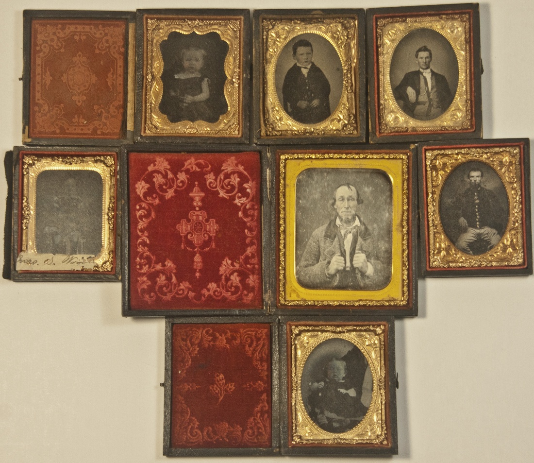 Daguerreotype Assortment. A group of seven smaller format (2 ½" x 2 ¾") Daguerreotypes. Four are images of children, and three are images of men. Also included are two larger (3" x 3 ¼") Daguerreotypes, one of a young child, and the other of a man. Some of these images are enhanced with touches of color. The covers are intact on only two of these examples, and there are five loose covers for the others. Sold as is, no returns.