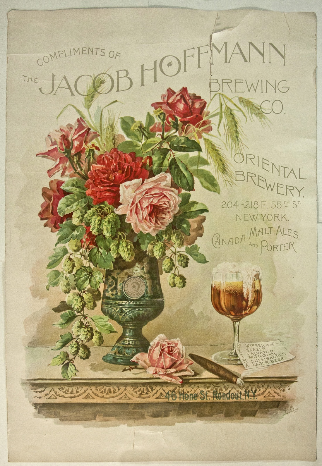 New York; Breweries - Jacob Hoffmann Brewing Co. Poster. Rondout, NY, ca. 1899. Colorful poster depicting flowers in vase, glass of beer and cigar on mantle; Compliments of Jacob Hoffmann Brewing Co. - Oriental Brewery / 204-218 E. 55th St. New York / Canada Malt Ales and Porter / 46 Hone St. Rondout, N.Y. 21 x 31". Number of long tears and splits at top. Rolled. Good