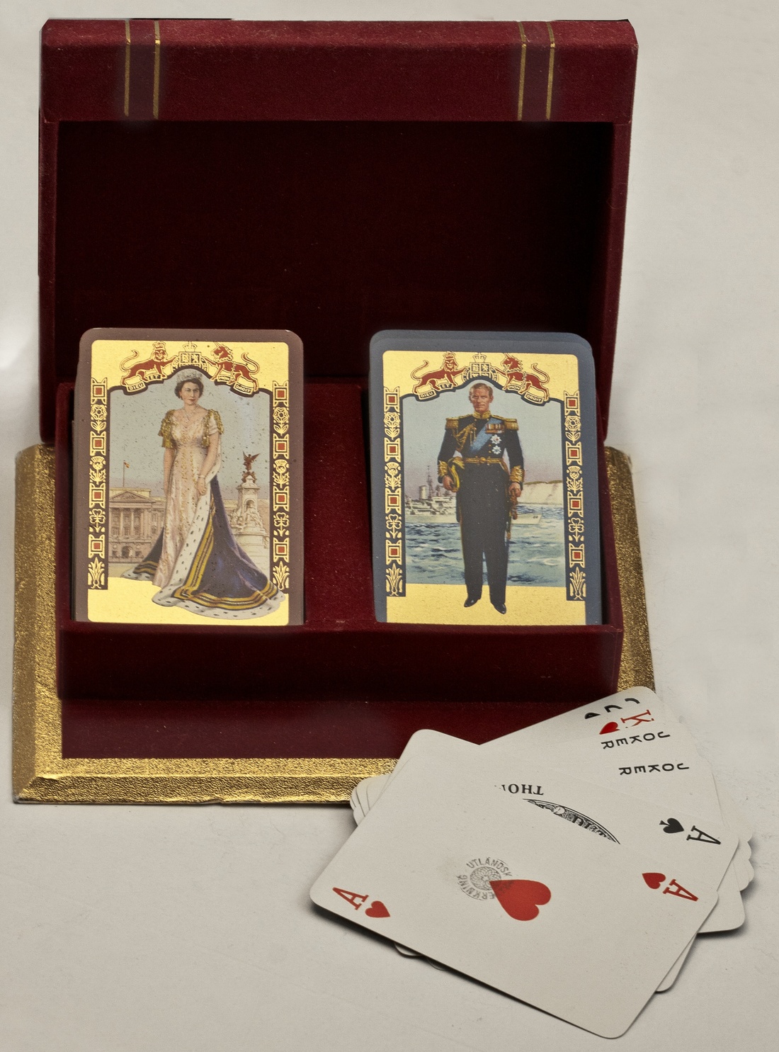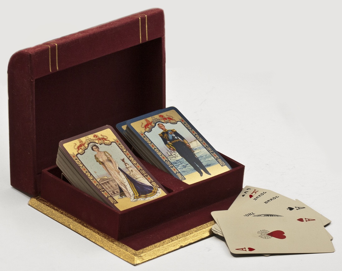 Great Britain. Elizabeth II Coronation 1953. Set of Playing Cards, composed of two decks, one showing Elizabeth II in coronation regalia, the other Prince Philip. In original, elegant display case. Very Fine.