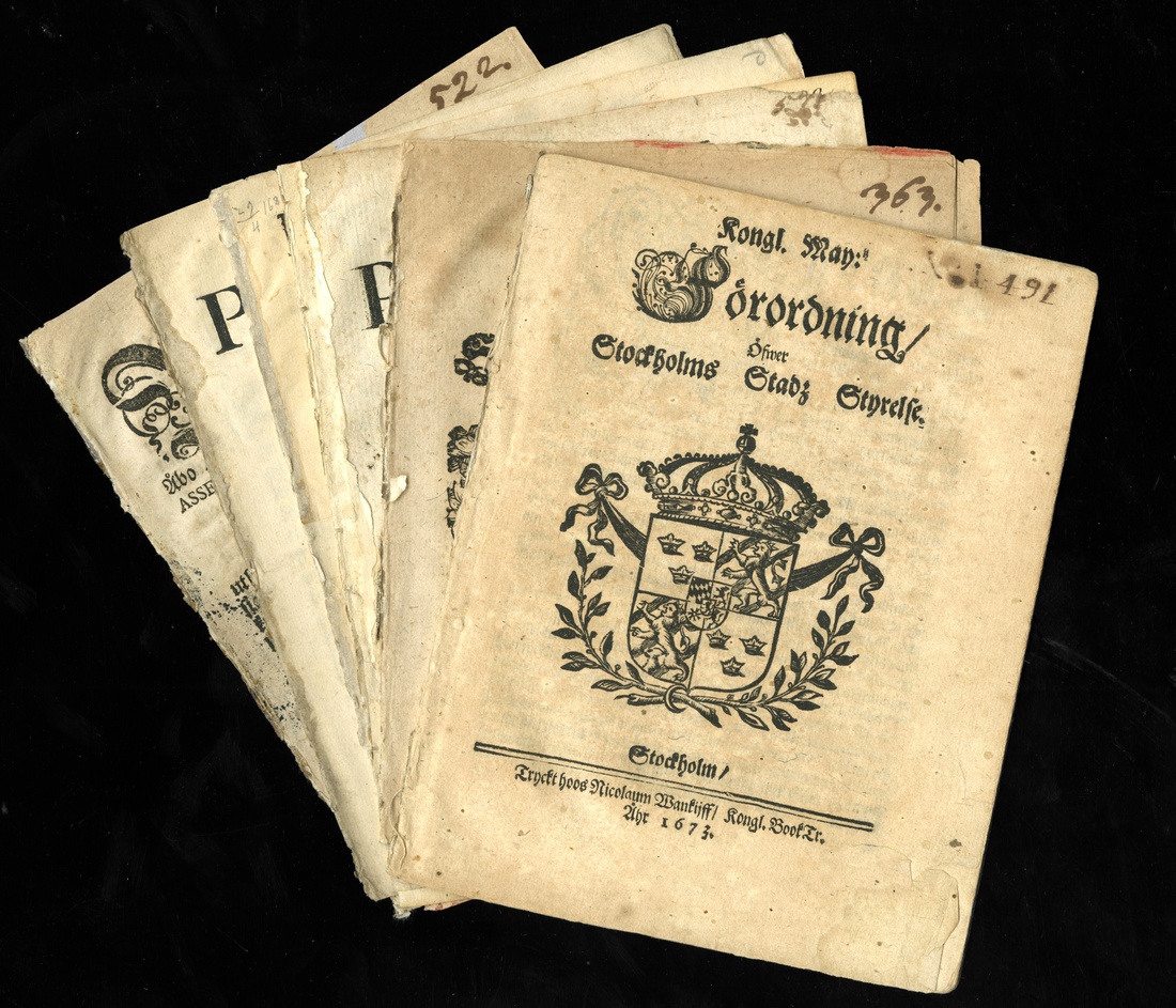 Sweden. 17th Century Royal Proclamations (5). Small format, pamphlet, 6 x 7 ½" on average. 1666, 1673, 1681, 1682, 1693. Covers illustrated with Arms, royal crown and on one, falcon in floral spray; ornate letters. Proclamations range from a few pages to one which is over 20 pages. One with old tape backing. Original and rare. Fine-Very Fine. [5]