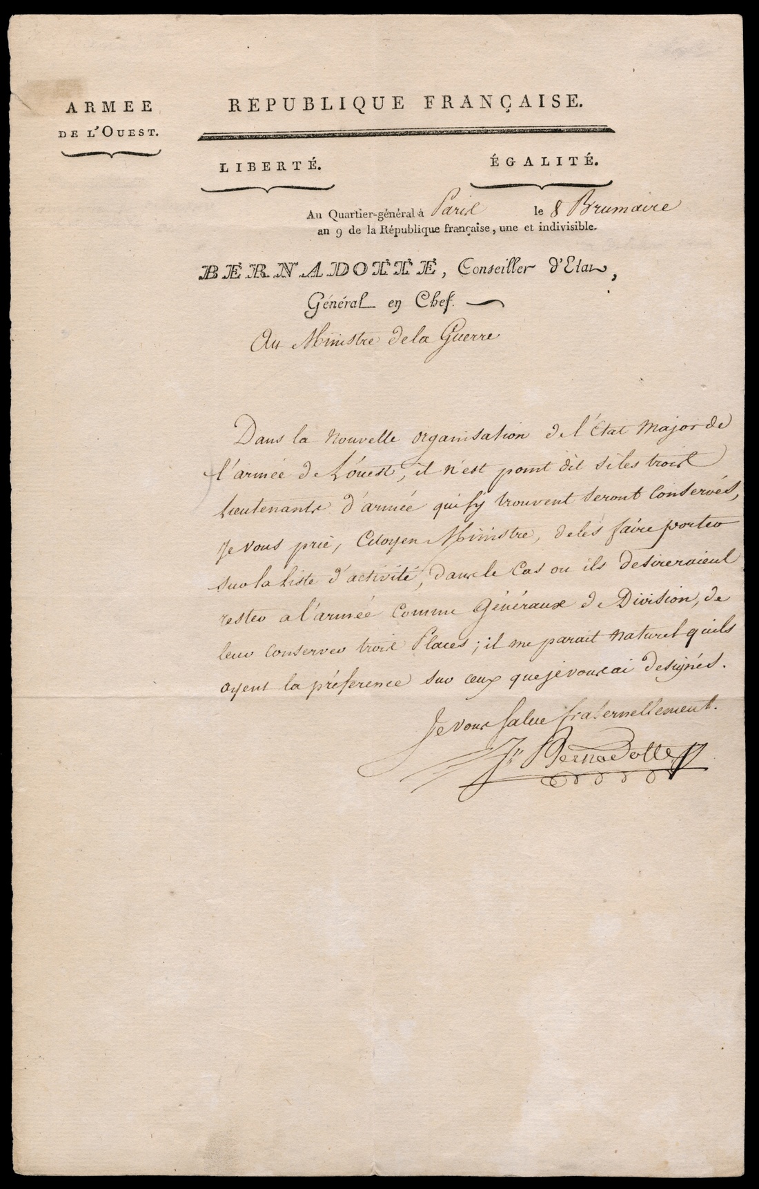 Bernadotte, Jean-Baptiste (1763-1844). Prince of Ponte-Corvo, Marshal of France, later King of Sweden as Karl XIV Johan. Son of a lawyer in Pau, Bernadotte entered the army in 1780. His excellent military qualities brought him rapid promotion after the outbreak of the Revolution. He was made a Marshal of France in 1806, and in 1810, he was elected heir-presumptive of the childless King Karl XIII of Sweden, going on to found the House of Bernadotte, the dynasty that still rules Sweden today. Autograph Letter Signed J. Bernadotte as Commander of the Army of the West (that was to invade England but never did). One page, folio, dated Paris, Oct. 30, 1800. In it, Bernadotte addresses the Minister of War (Lacuée -- who became Minister per interim after Carnot's resignation on Oct. 8). Bernadotte calls the Minister's attention to the fact that it has not been decided whether three Army Lieutenants should be kept on the active list. He asks the Minister for them to stay with his Army, so that they can be employed as heads of divisions, if they so desire. They might even get priority over generals he previously named. Tiny, unobtrusive tear upper left with old tape backing. Fine. Accompanied by a 19th Century engraving of Bernadotte. [2]