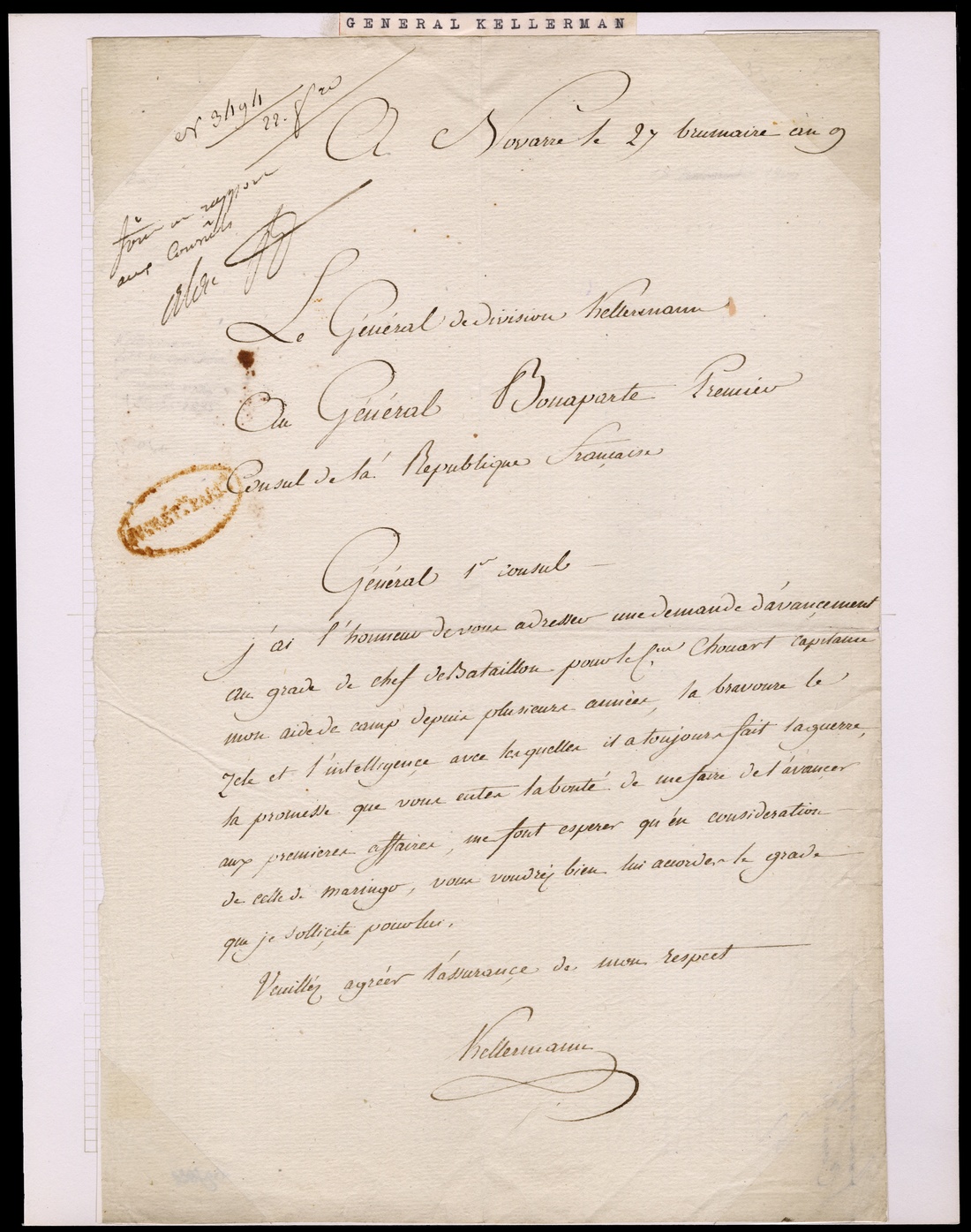Kellerman, François Étienne (1770-1835). Duc de Valmy, one of Napoleon's most brilliant cavalry commanders, noted for his daring and skillful exploits. His heroic charge decided the Battle of Marengo. On the eve of that battle, Napoleon made him a General of a Division, but never bestowed any other favors after - perhaps because Kellerman outshone Napoleon's dear friend Genereal Desaix at the battle. Despite their tensions, Kellerman joined Napoleon during the "Hundred Days" and was wounded at Waterloo. Autograph Letter Signed Kellerman. One page, folio, dated 27 brumaire An 9. Kellerman writes to Napoleon, General 1st Consul "I have the honor to send you a request for advancement to the rank of Chief of Battalion for Citizen Chouart, Captain, my Aide-de-Camp for several years. His gallantry, ardor and intelligence in combat and the promise that you were kind enough to give me concerning his advancement at the first occasion, let me hope that, in consideration of Maringo [sic], you would grant him the rank I am asking for him. Accept the assurance of my respect.. Trivial, unobtrusive tear at lower right edge. About Fine.