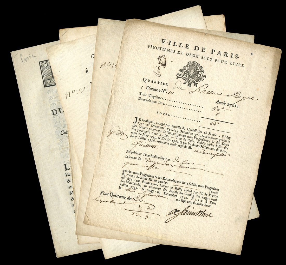 France. Pre-Revolution Documents related to the Posts and Taxes: 1-2) "Arrest du Conseil d'État du Roi Concernant les Contre-seings & Franchises des Lettres" (Proclamation of the King's State Council regarding the Franking and Franchises of Letters). 15 January 1771. 7-page pamphlet, and "Arrêt du Conseil d'État du Roi Concernant les Contre-seings & Franchises des Lettres" Aug. 11, 1787. 6-page pamphlet; 3-4) Postal certificates, 1747 for the receipt of 20 Livres and for 87 Livres. 7 ¼ x 9 7/8"; 5) City of Paris Receipt for taxes paid on 1761 income for a house in the Rue du Four, registered here as belonging to the Quartier of the Royal Palace. 7 ¼ x 9 1/2". Very Fine. [5]