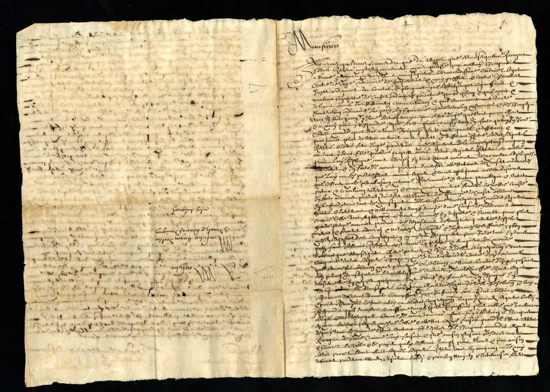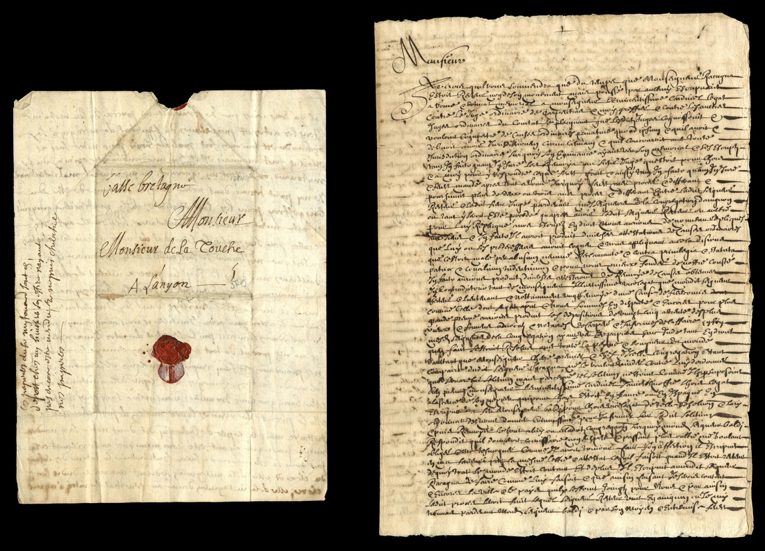 France and Italy. Small group of 16th-17th noble Letters and Documents: 1-2) Short letters in French from and signed by Balthazar Rangoni, Marquis di Longiano, dated 1565. 8 ½ x 12 ¾ ". One a single paragraph, the other two paragraphs. Residue of wax seal still affixed to one. Small body holes at fold, stains. Good; 3) 1580 letter in Latin addressed to Sers/sme Princeps D.D. Clem/me. One page, folio, addressee Sers/mo Principi ce dno dno Carolo Dei Gratia …Achid. Austriae, duci Burgundiae etc. Comiti - etc. D.D. Cle/me. Some folds on edge, VG; 4) "Bando per Occasione di Peste" (Notice of Plague), Mantova 16 June 1611. In Italian. One page, 7 7/8 x 11 ½". Crowned Arms at top, embellished first letter. Browning of about one half. Otherwise Fine; 5) 1642 letter in French. Three pages, folio. Fine; 6) 1694 letter in French, addressed to Monsieur de la Touche a L'anyon--. Three pages, smaller format. VG. Interesting group, some possibly rare and in need of further research. [6]