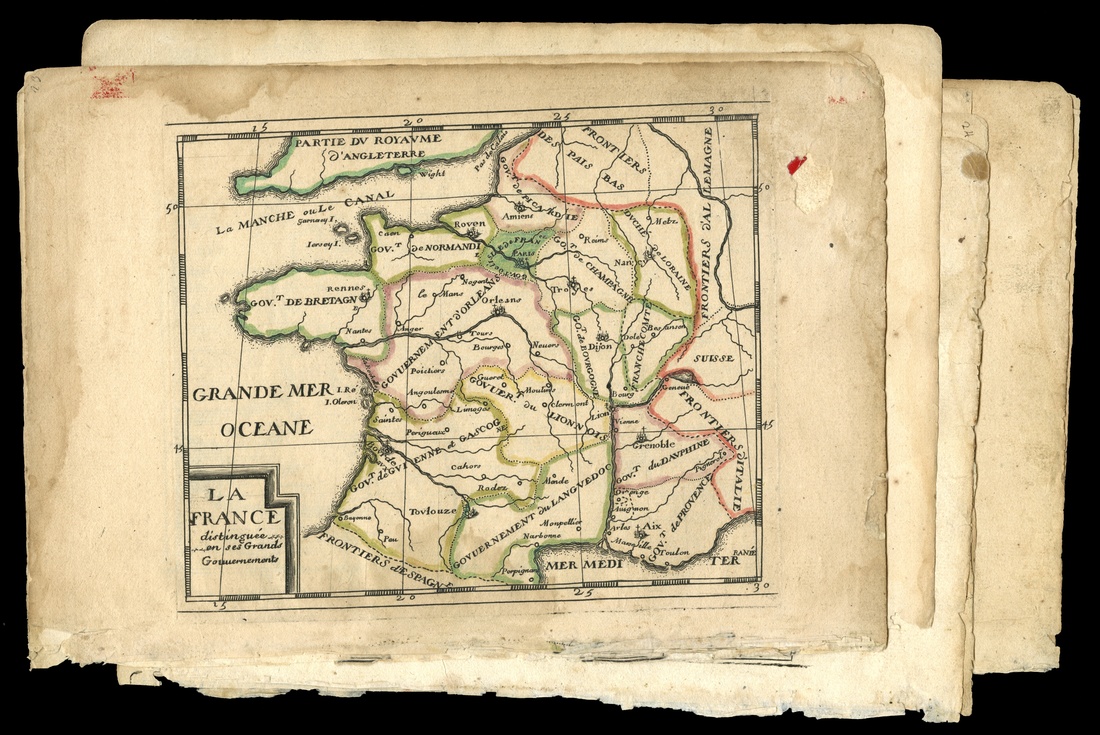 France. A group of nine 17th Century Maps: La France, Govvernet. General d'Orleans, Lorraine, Champagne Noyon, Picardie et Pays Reconquis, Isle de France, Gouvernment General de Guienne et Gascogne, Langvedoc, and Dauphiné Eschelle. Colored. 9 ¾ x 6 7/8". "La France" with hole in blank margin, "Isle de France" with edge missing from upper left border. Some staining in blank borders. Fine. [9]