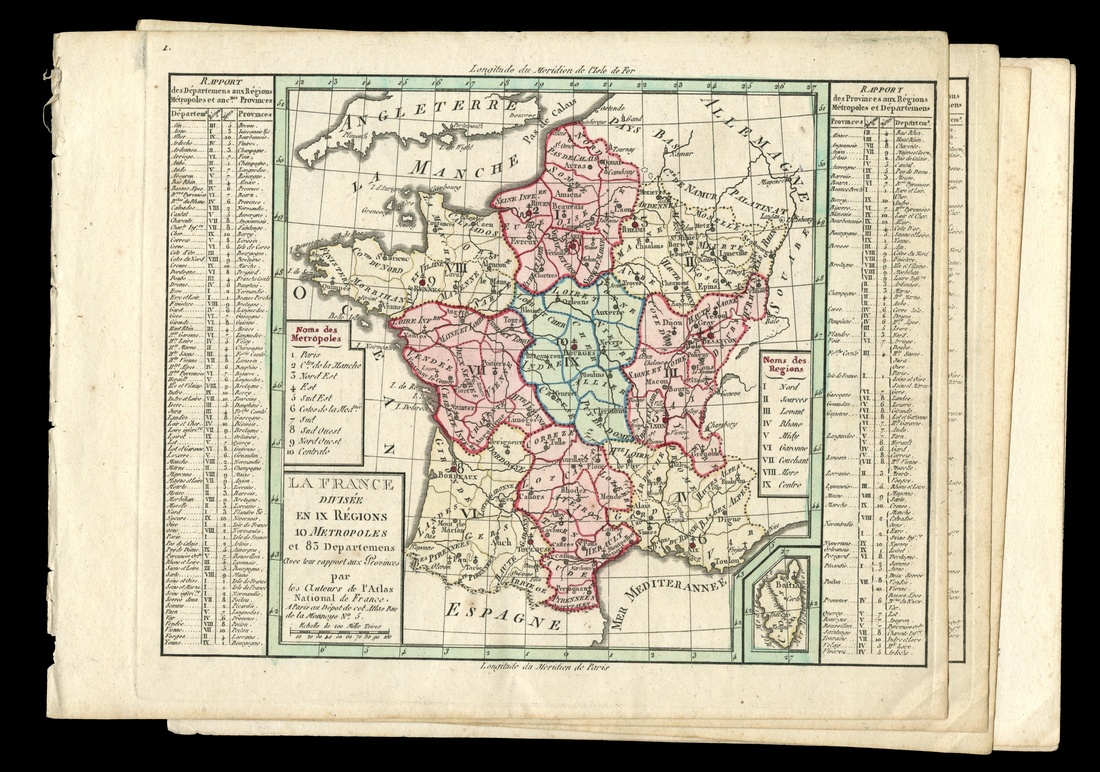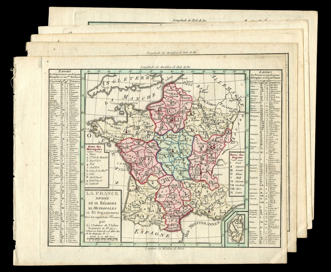 France. Five maps from the "Atlas National", ca. 1793-1794. La France Divisée en IX Regions, 10 Metropoles, et 83 Departemens, Département des Landes divisé en 4 Districts…, and Département de la Vienne…. Colored. 10 5/8 x 8 1/3". Very Fine. [5]
